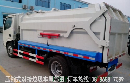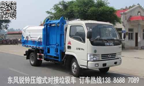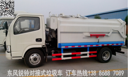 東風(fēng)銳鈴壓縮式對(duì)接垃圾車,底盤采用DFA1070SJ35D6,此車型分東風(fēng)多利卡朝柴發(fā)動(dòng)機(jī)100馬力、東風(fēng)銳鈴輕型發(fā)動(dòng)機(jī)102馬力,廣西玉柴發(fā)動(dòng)機(jī)90馬力。軸距3300mm,188mm等截面車架,前橋1.8噸,后橋3.5噸,7.00R16鋼絲胎,單排1730駕駛室,24V電瓶,有動(dòng)力轉(zhuǎn)向,氣剎制動(dòng),有離合器助力,五檔變速箱,彈簧片數(shù)6/6+5. 東風(fēng)國(guó)四多利卡壓縮式對(duì)接垃圾車可選用東風(fēng)輕型發(fā)動(dòng)機(jī)、廣西玉柴發(fā)動(dòng)機(jī)、朝柴發(fā)動(dòng)機(jī)或江蘇四達(dá)發(fā)動(dòng)機(jī),汽剎,東風(fēng)5檔變速箱,7.00-16輪胎,24V雙電瓶,整車可裝載垃圾4-5立方米。